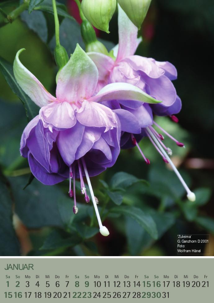 Die Fuchsiensorte 'Zuleima' hat große gefüllte Blüten mit weißen Sepalen und eine violettblau und weiß geflammte Korolle. Sie wächst kräftig aufrecht, verzweigt sich gut und ist reichblühend.
