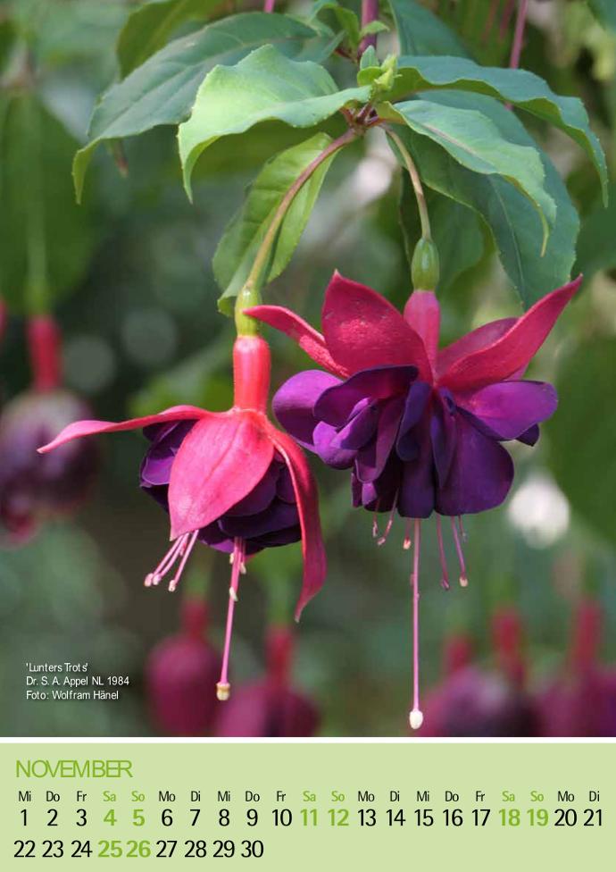 Diese Sorte hat sehr große gefüllte Blüten mit roten Sepalen und einer violetten, an der Basis rötlichen Korolle. Sie ist reich-blühend und starkwachsend. Der Wuchs ist aufrecht bis über-hängend mit sehr langen Trieben, die mehrmals gestutzt werden sollten.
