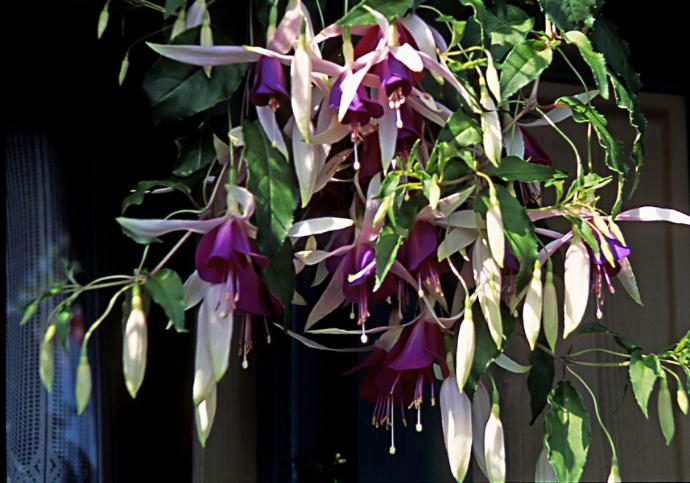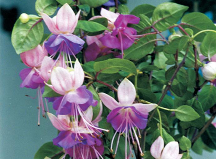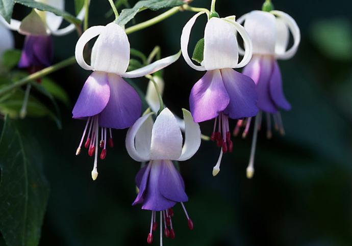 Gut verzweigter Wuchs, dunkelgrünes gesundes Laub, weiche überhängende Triebe. Eine der schönsten weiß-blauen Hängefuchsien. Im Verblühen ändert sich das Blau in blauviolett, reich blühend. Für Balkon und mittelgroße Ampeln an halbschattigen Standort empfohlen.