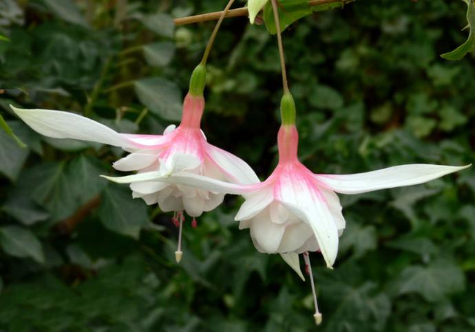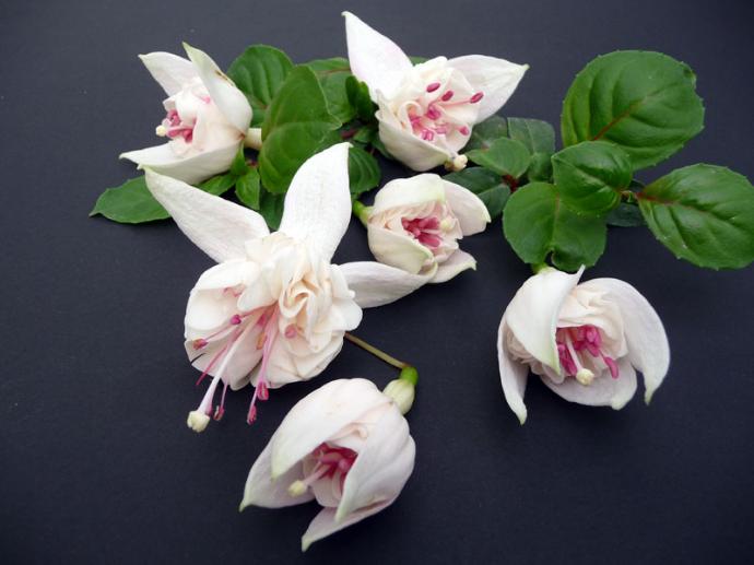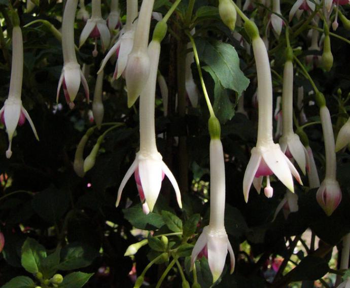 Etwas besonderes, eine weiß/rosa Fuchsie mit langem Tubus, sehr gutem Wuchs. Sie sollte als Jungpflanze entspitzt werden. Reich blühend für Beet, Schalen und Busch geeignet.