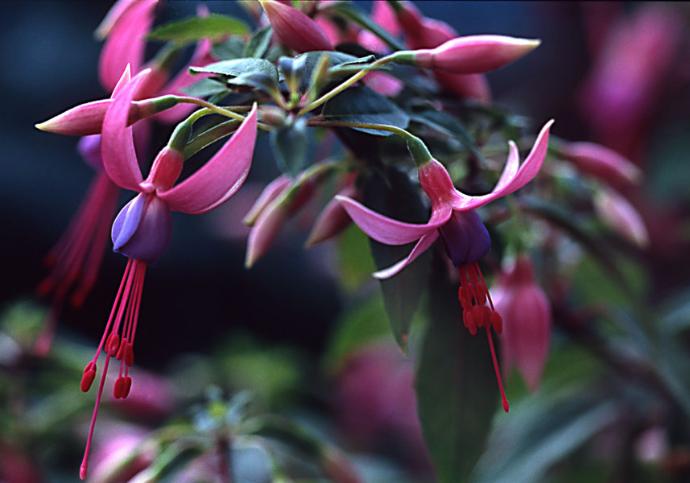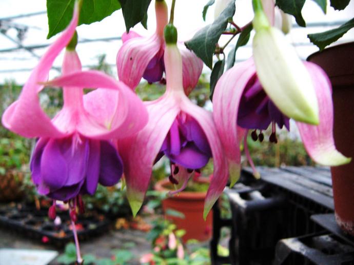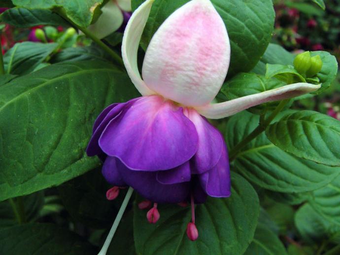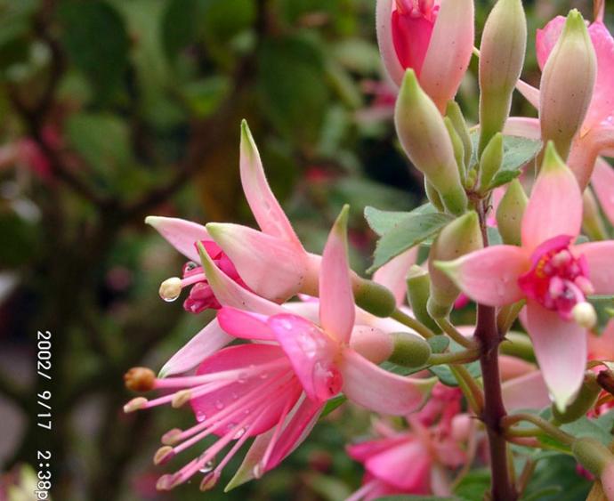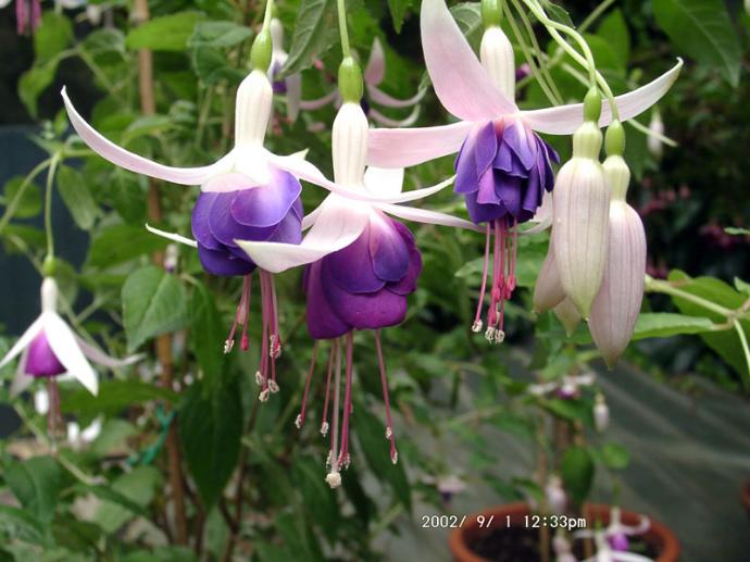 Früh blühende Fuchsie, kleine Blüten mit rosa Sepalen, helllila Korolle und extrem langen Staubfäden. Die Knospen sind leicht seitlich gestellt und besonders gut sichtbar, sehr reich blühend. Gute Verzweigung, darum besondere Eignung als Busch, Kübel und Hochstamm, kaum zutun erforderlich. Sie hat sich bisher an allen Plätzen gut bewährt.