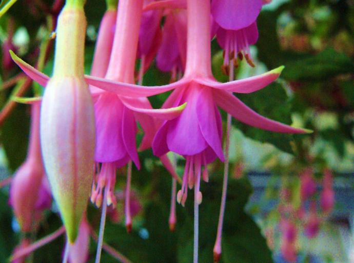 Sport von Pink Fantasia, einfache rosafarbene Blüten, seitlich abgestellt und deshalb sehr gut sichtbar. Sehr reich blühend, kräftig aufrecht wachsend. Optimale Eignung als Busch und als Beetfuchsie, da die Blüten nicht versteckt sitzen.