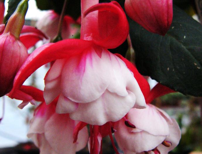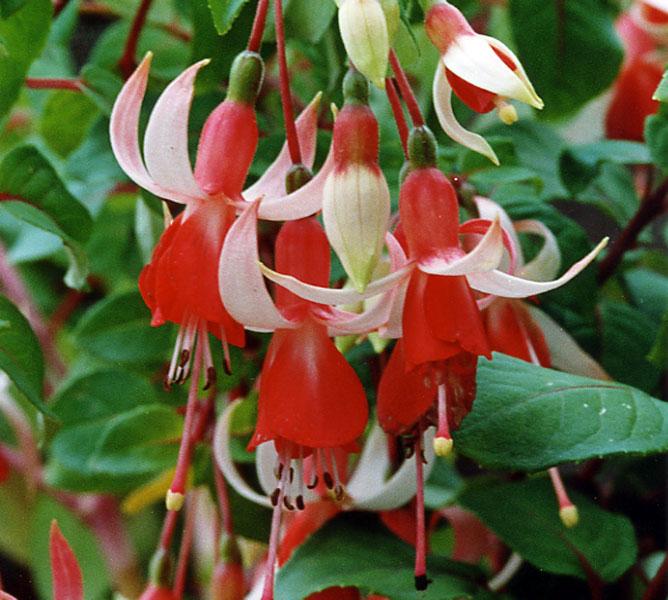 Blüte einfach bis halb gefüllt,Tubus und Sepalen weiß, Korolle leuchtend rot, orange geflammt. Wuchs halbhängend. Dankbare kompakt wachsende Sorte. Kreuzung: `Anita` x `Aladnas` Sander`.