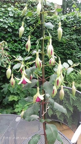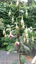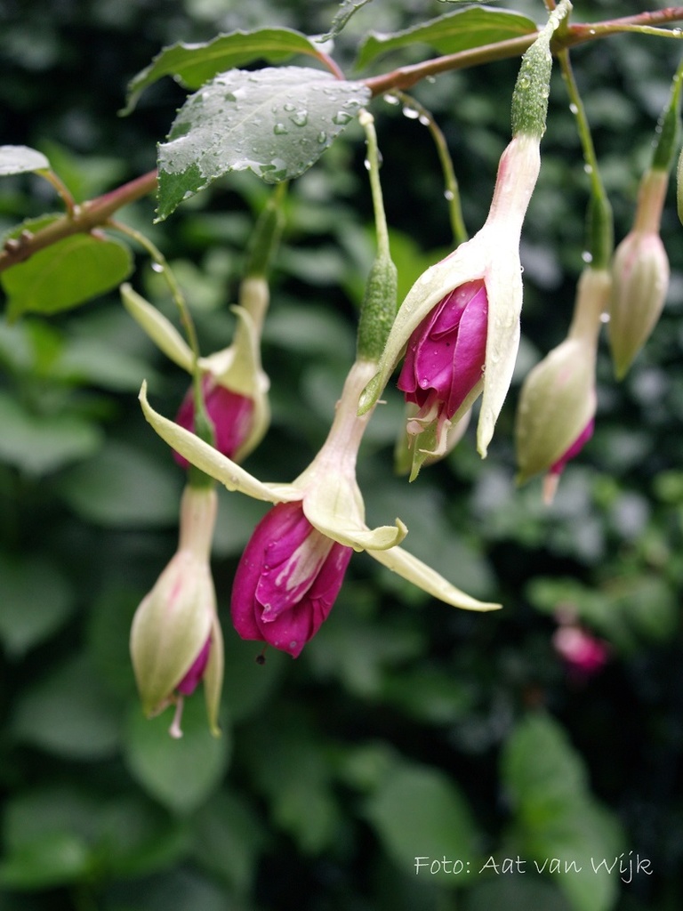Diese in allen Teilen zierliche Fuchsie entdeckte ich in der Gärtnerei van der Velde. Der Namensgeber ist in der Fuchsienwelt bekannt als Künstler für Aquarellmalerei. Mit seinen schönen Werken unterstützt er bspw. die DFG bei der Gestaltung des Fuchsienkuriers. Die Fuchsie 'Aat van Wijk' bleibt zierlich, die Blüten öffnen sich nicht immer ganz. Aat van Wijk schreibt über diese Fuchsie: AvW wächst langsam und unregelmässig. Im Herbst nehme ich einige Stecklinge, die überwintern dann im Haus, Die alten Exemplare überwintern im Gewächshaus.