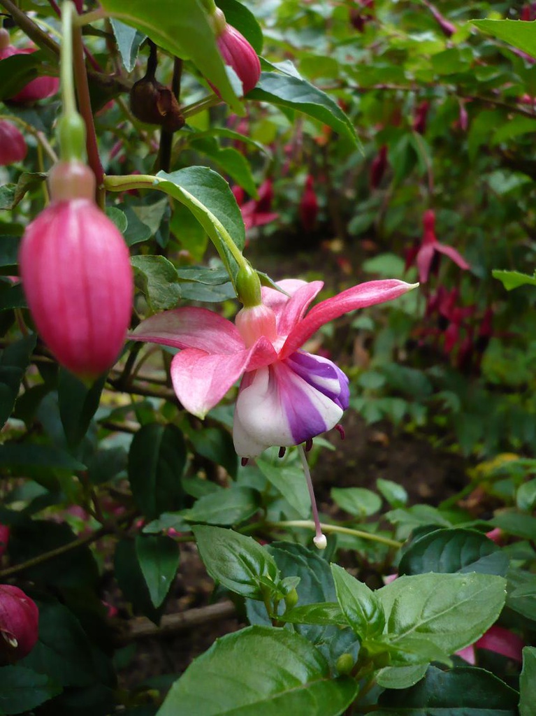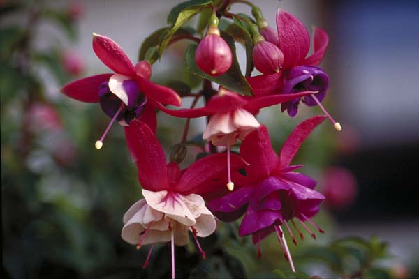 Mit 'Berba's Trio' hat Mevrouw Bats, die holländische Züchterin, den Fuchsienfreunden etwas völlig Neues, von allen bisher bekannten Fuchsien Abweichendes, geschenkt. Das Besondere: Die Blüten zeigen innerhalb der vorgegebenen Farbscala von Rot, Weiß und Blau eine breite Palette von Farbkombinationen an der gleichen Pflanze. Es war 1984 auf der Fuchsienschau in Bredevoort, als diese Neuigkeit zum ersten Mal einen breiten Publikum vorgestellt wurde. Damals war 'Berba's Trio' eine Sensation, die eigentlich zuerst ungläubiges Staunen hervorrief. Manche Leute waren skeptisch, untersuchten den ausgestellten Topf genau und glaubten offenbar, es wären mehrere Sorten in einen Topf gepflanzt worden. Inzwischen sind auch die letzten Zweifler von damals überzeugt, dass alles mit rechten Dingen zugeht. Wenn man wirklich mehrfarbige Nachkommen haben will, müssen Stecklinge allerdings von Trieben mit allen drei Farben geschnitten werden. Genetisch fixiert ist diese Neuzüchtung nicht. Von dem gut verzweigten, dicht belaubten, überhängenden Wuchs her ist diese farbenfrohe Schönheit am besten in einer Ampel zu präsentieren.