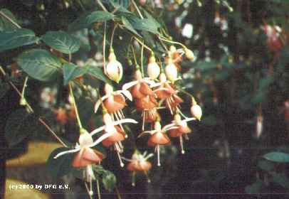 Buttercup' ist eine von mehr als zwanzig modernen Fuchsiensorten des kalifornischen Züchters Ted Paskesen. Sie hat schnell weltweite Verbreitung gefunden. Nur Gutes setzt sich auf die Dauer durch,und hier haben wir es mit einer guten,stark- und aufrechtwachsenden Fuchsie zu tun. Sie zeichnet sich durch gute Widerstandskraft gegen übermäßigen Regen und Hitzebeständigkeit im Schatten aus. Wir können sie als Busch oder Hochstamm ziehen und an leicht beschatteten Plätzen auch in den Garten pflanzen. Die reichblühende Pflanze hat mit ihren frischen,klaren Farben eine hervorragende Fernwirkung. Sie vermag dunklere Standorte auf sehr dekorative Weise aufzuhellen. Die mittelgroße Blüte mit der schalenförmigen Korolle ist hübsch geformt,orange mit weißer Basis und horizontal gestellt. Tubus und Sepalen variieren in der Farbe vom reinsten Weiß bis zu hellem Orange,je nach Helligkeit des Standortes. Die vier unten abgerundeten Petalen sind weit,eben schalenförmig,ausgestellt. Die schmalen Sepalen sind ganz waagerecht ausgebreitet,nur die äußeren Spitzen biegen sich leicht nach unten.