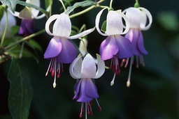 Einfache,mittelgroße Blüte,weiß - blau, dass sich bis zum Verblühen in mehrere Schattierungen verändert,fällt oft auf als Fuchsie mit 3 verschiedenfarbigen Blüten. Wuchs straff aufrecht,sehr schön als Hochstamm mit 1,00 - 1,80 m.