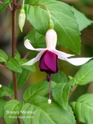 ’Breevis Minimus’ besticht den Betrachter durch ihre intensive Blütenfarbe, die einem sofort auffällt. Diese schöne Sorte macht in keinerlei Hinsicht irgendwelche Schwierigkeiten. Bei mir steht die Sorte im Halbschatten. Tubus und Sepalen erscheinen da mehr cremeweiss. Solche kleinen Farbunterschiede sind mit dem Standort und den Lichtverhältnissen beim Fotografieren zu erklären. Ansonsten hat die Sorte einen guten Wiedererkennungswert. Sie lässt sich problemlos überwintern.
