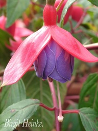 Birgit Heinke' nicht die erste,aber eine Züchtung der ersten Jahre von Herrn Strümper. Diese Sorte ist ein klassisches Beispiel dafür,wie schnell eine der schönsten Liebhabersorten sich die Welt und den Markt des produzierenden Gartenbaus erobern kann. Sie hat folgende Attribute,die alle als positiv zu Buche schlagen. Frohwüchsigkeit,leistungsfähiges Wurzelsystem,kurze Internodien und damit Vieltriebigkeit,mittelgroßes,ausdrucksvolles Blatt,bestens geeignet für Ampeln und Blumenkästen aber auch für Stämmchen,Wetterfestigkeit und ein wunderschöne gefüllte Blüte,die sehr früh erscheint. Die runde,leuchtend rote Knopse bringt schnell eine gefüllte Korolle hervor,nachdem sich die Sepalen anmutig nach oben gebogen haben. In das warme Violett spielt eine rote Flamme,die insgesamt Lebendigkeit erzeugt. (Entnommen aus Fuchsienkurier 1/1998)