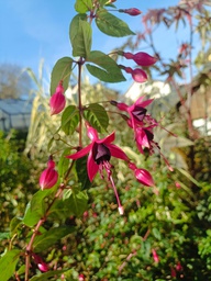 Es ist eine Züchtung von Yorke, GB, 1943. Sie wird als halbhängend oder überhängend beschrieben. Ich habe sie schon mehrere Jahre, und zwar als Ampelpflanze. Es ist eine außerordentlich dankbare Fuchsie. Ich brauche sie nicht sonderlich zu entspitzen, sie blüht sehr reich und das ohne Unterbrechung! Ihre hellen, kugeligen Knospen sind schon für sich ein herrlicher Kontrast zu dem schönen glatten, mittelgrünen Laub. Jedoch die Blüten, von einfach bis halbgefüllt, geben der Fuchsie ein Farbenspiel erster Güte! Sie gilt als winterhart in der Klimazone 6. Das ist der Minustemperaturenbereich von ~ -23° bis -18°. Falls sie ausgepflanzt werden sollte, so sollte man unbedingt ein etwas erhöhtes Beet o.ä. auswählen.
