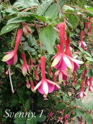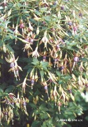 Mit "Zuckerbüschchen" könnte man den Namen dieser sehr ansprechenden Sorte des holländischen Züchters Brouwer übersetzen. An den länglichen, zierlichen Blüten, dem buschigen Wuchs und dem dichten kleinen Laub ist die Abstammung von Fa. magellanica deutlich zu erkennen. Die Pflanze ist problemlos in jeder Hinsicht. Ich werde gelegentlich testen, ob sie nicht sogar winterhart ist. In jedem Fall ist es eine unermüdlich bis in den Oktober blühende, robuste Gartenpflanze, die mit ihrer Höhe von etwa 70 cm auch für kleinere Gärten geeignet ist. Neu für eine Sorte der Magellanica-Gruppe ist die schöne rosaviolette Blütenfarbe. Da die Pflanze die Blüten seitwärts ausstellt, ist die rosarote Unterseite der Sepalen gut sichtbar. Leider verblüht die hellviolette Korolle rötlich wie bei vielen Fuchsien, doch bei der Menge der Blüten fällt das nicht so auf. Auf den Ausstellungen der letzten Jahre in Holland wurden als Säulen oder Hochstämme gezogene Exponate dieser Sorte viel bewundert. So erhielt sie das Verdienstzeugnis Aalsmeer, August 1982.