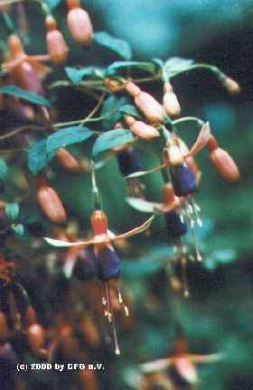 Derby Imp' mit eher kleinen aber sehr charmanten Blüten,ist eine vielseitig verwendbare,immer dankbare Fuchsie. Der leicht überhängende Wuchs mit den biegsamen,drahtigen Zweigen macht es möglich,sie als Busch für Topf oder Kasten,als Ampelpflanzen oder als Fußstämmchen zu ziehen. Für Versuche,Minifuchsien oder gar Bonsais zu formen,ist diese Sorte besonders geeignet. Da nach jedem Entspitzen alle schlafenden Augen gleichzeitig austreiben,entstehen schön gewachsene,symmetrische Pflanzen. Die Kleinblütigkeit wird durch eine extreme Reichblütigkeit kompensiert. Aus jeder Blattachsel sprießen vier bis sechs Blüten gleichzeitig. Dazu ist sie ein Frühaufsteher,der lange vor den meisten anderen Fuchsien zu blühen beginnt. Hübsch ist die Art und Weise,wie jede Blüte durch die seitwärts Stellung zu voller,individueller Geltung kommt. Besondere Probleme bei der Kultur oder der Überwinterung gibt es nicht. Ganz wichtig ist regelmäßiges Entspitzen, versäumen wir das,macht die Pflanze lange Triebe,die nur am Ende blühen.