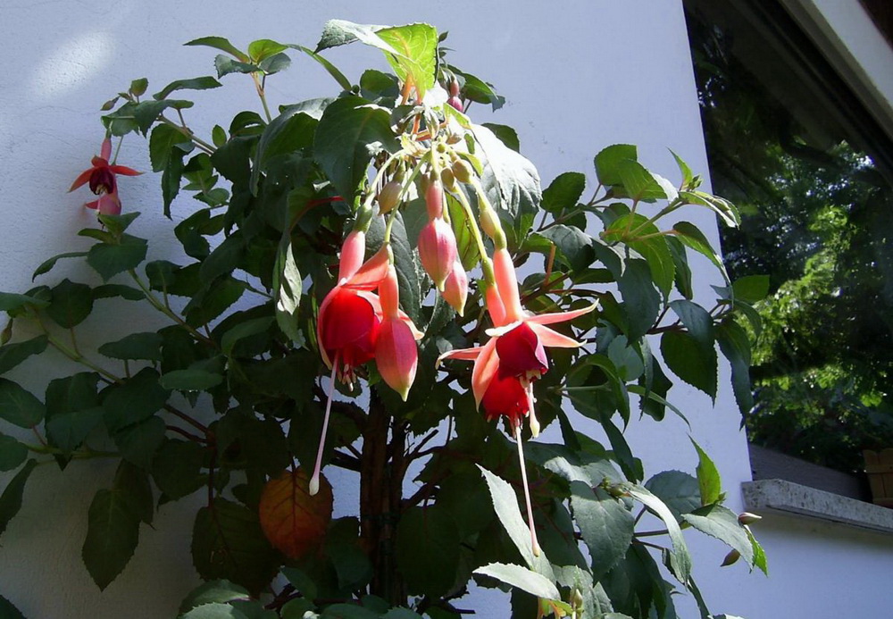 Die Blütenfarbe dieses Fuchsien - Kultivars ist sehr apart. Fast möchte ich sie als kastanienrot bezeichnen. Jedenfalls fällt sie aus dem Rahmen der bei Fuchsien bekannten Farbschattierungen. Besonders schön ist die Ausfärbung an einemsonnigen Standort. Auf dem schönen Foto von Herrn Weihrauch können wir gut erkennen, dass er seine Aufnahme im Treibhaus gemacht haben muss. Der Tubus ist hell, allenfalls lachsrosa und stimmt absolut nicht mit meiner obigen Beschreibung überein. Wir können diese Erscheinung immer wieder beobachten. Fuchsienblüten unter Glas und dieselben im Freien sind oft völlig verschieden voneinander, das erschwert die Identifizierung beträchtlich. Vom Wuchs her kommt diese schöne robuste Pflanze in Balkonkästen oder größeren Ampeln zur schönsten Wirkung. Hochstämme formen eine dichte Krone, wenn man in den Monaten der Anzucht fleißig entspitzt. Lässt man die Pflanze natürlich wachsen, ohne durch diesen regulierenden Eingriff den Wuchs zu steuern, blüht sie erst relativ spät am Ende langer Triebe. Der Züchter Victor Reiter senior, Amerikaner deutscher Abstammung, hat zusammen mit seinem Sohn seit 1939 sage und schreibe 90 neue Fuchsien herausgebracht, darunter so populäre Sorten wie 'Flying Cloud',' Mantilla' und 'Fanfare'.