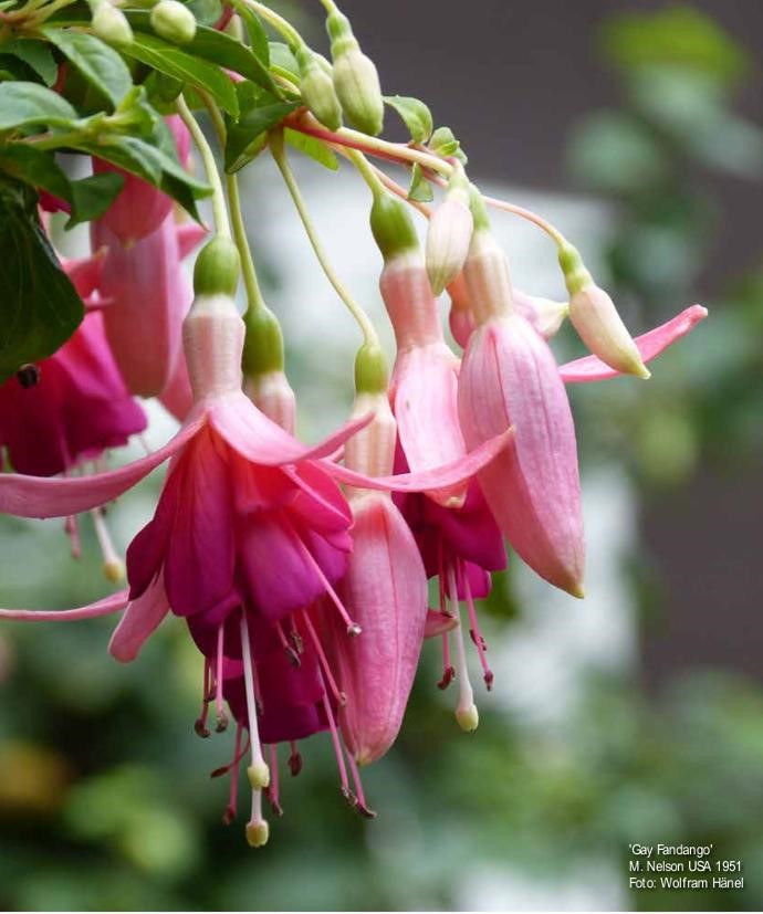Gay Fandango' verbindet - wie so viele ältere Fuchsiensorten - Robustheit, Starkwüchsigkeit und Reichblütigkeit mit dem Charme schön geformter, bezaubernd gefärbter, großer Blüten, die noch dazu von hervorragender Substanz sind, und darum lange haltbar. Der kräftige Wuchs und die zu dritt oder viert quirlig um die Äste stehenden Blätter sind eine sehr gute Voraussetzung für die schnelle, problemlose Anzucht größerer Pflanzen wie Hochstämme oder Pyramiden. Es macht schon einen großen Unterschied bei der Kronenformung, ob aus einer Blattachsel zwei, drei oder gar vier Triebe entstehen. Weil alte Pflanzen gut überwintern und früh im Frühjahr wieder zu treiben beginnen, kann man diese vielen Triebe auch mehrmals stutzen, das Ergebnis sind dichte, reichblühende Kronen. Selbst Rückschnitt in das ältere Holz wird gut vertragen. Wie auf dem Foto zu erkennen, ist diese Sorte durch den leicht überhängenden Wuchs auch gut als Ampelpflanze zu verwenden.