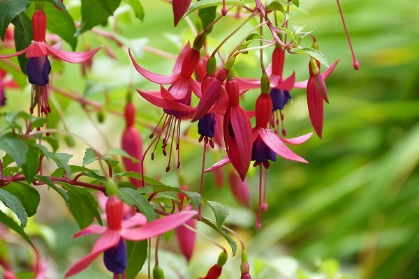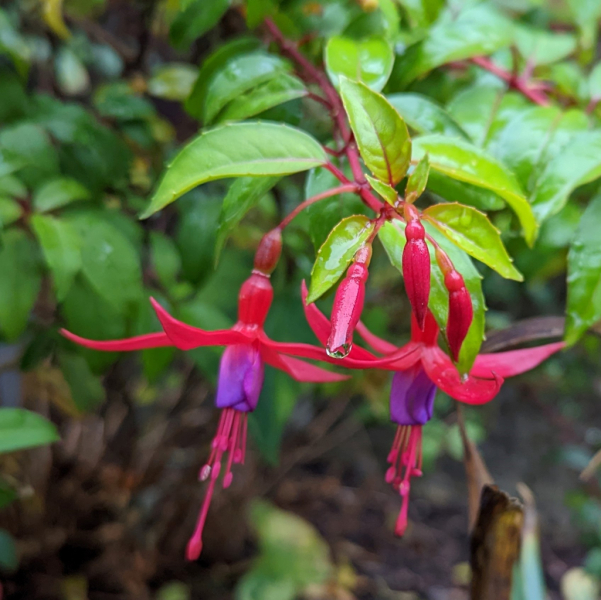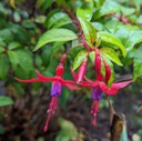 'Genii' ist eine absolut winterharte Fuchsie, ich mag sie besonders wegen des schönen goldgelben Laubes mit der roten Aderung, aber auch die klaren Blütenfarben und die Blütenform sind nicht zu verachten. Die Sepalen sind leuchtend rot, die Korolle ist blauviolett gefärbt, an der Basis befinden sich kurze rote Streifen. Der Stempel ist sehr lang und rot. Die Staubfäden bleiben ziemlich kurz und die Pollen sind ebenfalls dunkelrot. Die Internodien leuchten rot durch das gelbgrüne Laub. Sie verzweigt sich sehr gut.'Genii' gehört zu meinen besten und liebsten winterharten Fuchsien. Sie wird nicht überreich groß, bleibt ein schöner kleiner Busch und kommt jedes Jahr treu und brav wieder. Der Busch wird zwar breiter, kräftiger aber nicht unbedingt höher, etwa 80 cm bis 1 m. Ich kann jedem, der winterharte Fuchsien mal testen oder damit anfangen will, 'Genii' nur empfehlen. Sie ist übrigens die Fuchsie unseres Freundeskreises Saar-Pfalz.