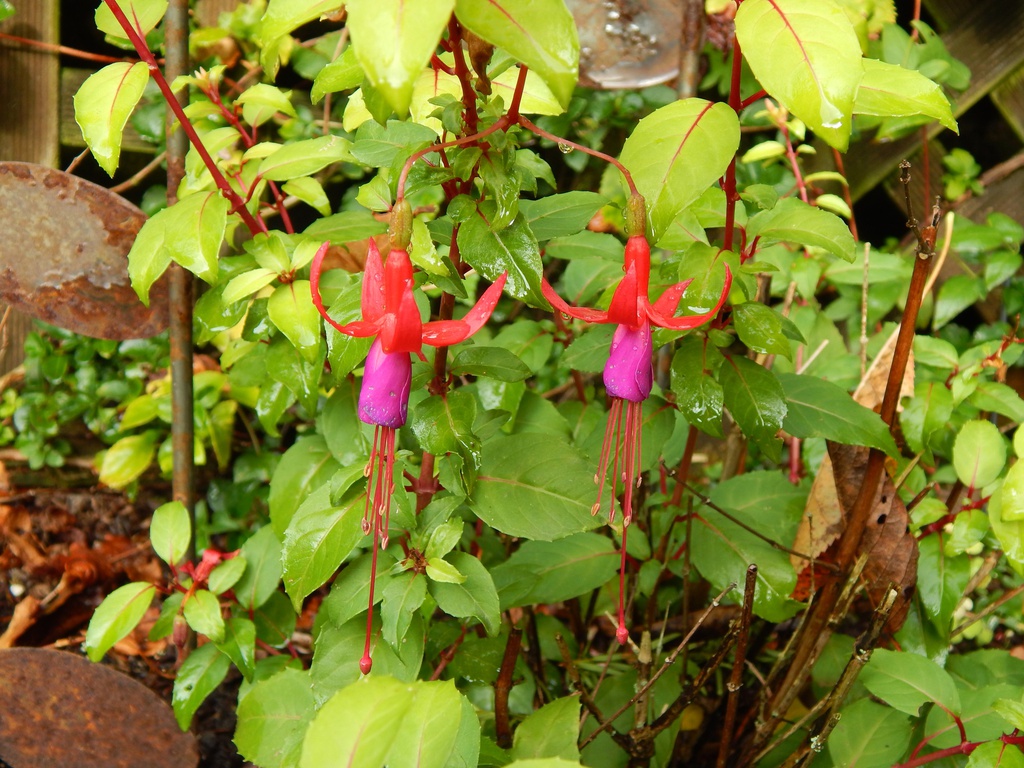 'Genii' ist eine absolut winterharte Fuchsie, ich mag sie besonders wegen des schönen goldgelben Laubes mit der roten Aderung, aber auch die klaren Blütenfarben und die Blütenform sind nicht zu verachten. Die Sepalen sind leuchtend rot, die Korolle ist blauviolett gefärbt, an der Basis befinden sich kurze rote Streifen. Der Stempel ist sehr lang und rot. Die Staubfäden bleiben ziemlich kurz und die Pollen sind ebenfalls dunkelrot. Die Internodien leuchten rot durch das gelbgrüne Laub. Sie verzweigt sich sehr gut.'Genii' gehört zu meinen besten und liebsten winterharten Fuchsien. Sie wird nicht überreich groß, bleibt ein schöner kleiner Busch und kommt jedes Jahr treu und brav wieder. Der Busch wird zwar breiter, kräftiger aber nicht unbedingt höher, etwa 80 cm bis 1 m. Ich kann jedem, der winterharte Fuchsien mal testen oder damit anfangen will, 'Genii' nur empfehlen. Sie ist übrigens die Fuchsie unseres Freundeskreises Saar-Pfalz.