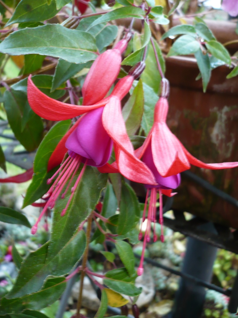 Diese Fuchsie, Schwester der Sorte 'Münstertal', zeigt wie unterschiedlich Pflanzen, nicht nur Fuchsien, bei gleichen Eltern, werden können. Ähnliche Merkmale sind die dunklen, gesunden Blätter. Sie sind aber wesentlich kleiner, das gilt auch für die Blüten, die sich dafür aber in reicher Zahl bilden. 'Grazie' ist stark wachsend, ihre Triebe sind biegsam und darum auch besonders gut geeignet für windige Standorte an Balkonen und als Ampeln an besonders exponiertem Platz. Sie verträgt volle Sonne und ist regenfest. Nach meiner Erfahrung eine der ganz wenigen wirklich robusten Fuchsien, die noch viel zu wenig bekannt ist.