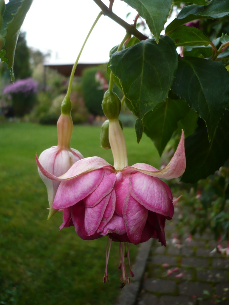 Die Sorte 'Jan van der Kuylen' begeistert jeden Liebhaber der großblütigen Fuchsien. Sie wächst schnell zu einem großen Stämmchen heran. Blüht reichlich,jedoch mit kleinen Blühpausen. Sie steht am Besten im Schatten bzw. Halbschatten. Sie sollte etwas Wind und Wetter geschützt stehen,denn die Zweige brechen leicht. Die großen Blüten hängen schön dekorativ über dem mattgrünen Laub. Die Knopsen sind ebenfalls etwas Besonderes denn sie haben die Form kleiner hängender Herzen. In der Abenddämmerung wirken die Knopsen und Blüten als weiße Tupfer. Eine absolute Bereicherung in einem Fuchsiensortiment.