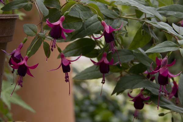 Kath van Hanegem' ist eine kleine,stehende und gut blühende,gesunde Fuchsie.Dicht wachsen ihre winzigen,dunkelgrün glänzenden Blättchen. Ich bewundere immer die vielen kleinen Blüten. Tubus und Kelch sind weinrot,die Krone noch dunkler gefärbt. Ich stelle diese Fuchsie,schon wegen ihrer Zartheit an eine geschützte Stelle ohne stark wachsende Pflanzen als Nachbarn.