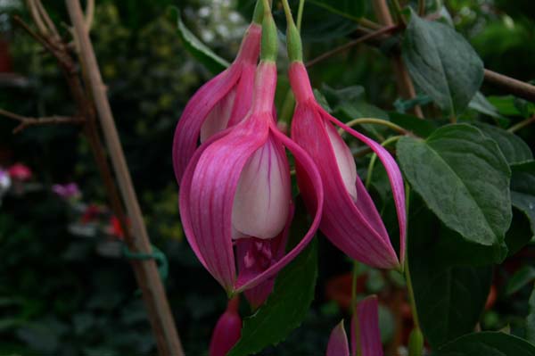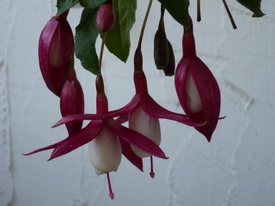 Die Blüten sind von besonders guter Haltbarkeit. Der Tubus und die Sepalen sehen wie gelackt aus. Das Weiß der Petalen wirkt so richtig frisch unter der dunklen auberginefarbenen Sepalen. Die dunkle Aderung in den Petalen verstärken diesen Eindruck noch.Selbst starke Sonne oder Regen machen ihr nichts aus. Allerdings sollte man sie öfter entspitzen damit sie sich schön verzweigt. Diese schöne Sorte ist ein kleines Juwel unter den Fuchsienfarben. ,Ich habe sie einfach wachsen lassen,so dass sie sich besonders schön in einer Ampel macht. Die sehr großen Blüten kommen so besonders gut zur Geltung.