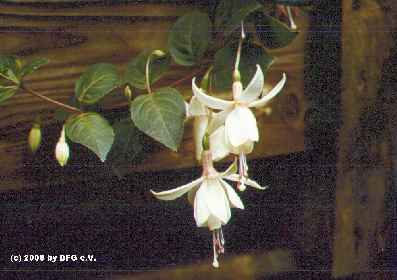 Wie alle "sogenannten" weißen Fuchsien müssen wir auch 'La Bianca' geschützt und schattig aufstellen. Helles Licht oder gar direkte Sonne bringen die latent vorhandenen blauen und roten Farbstoffe wieder zum Vorschein und verfärben dieBlüte rosa. Regentropfen und Gießwasser hinterlassen beim Abtrocknen braune Flecken auf den Blüten. Dadurch wird die Schönheit sehr beeinträchtigt. Zu den robusten Fuchsien können wir 'La Bianca' nicht rechnen. Sie hat nur ein relativ schwach ausgebildetes Wurzelsystem,darf darum nicht zu schnell in größere Töpfe gepflanzt und sollte vorsichtig gegossen werden. Auch vorbeugender Schutz gegen Botrytis ist - besonders im Winter,aber auch in nassen Sommern mit hoher Luftfeuchtigkeit - ratsam. Die delikate Schönheit der wohlgeformten Blüten rechtfertigt aber jeden Pflegeaufwand.. Ich möchte dieses Cultivar in meiner Sammlung nicht missen. Horace & Daniel Tiret,die Züchter von 'La Bianca' leben in San Francisco und haben seit 1947 etwa 124 neue Fuchsien herausgebracht. Die prominenteste ist 'Swingtime',weit verbreitet und vielgeliebt. Schon bei uns vorhanden - um nur einige zu nennen - sind 'La Neige','Lace Petticoats','Orange Mirage','Papa Bleuss','Sonata' und 'Sweet Leilani'.