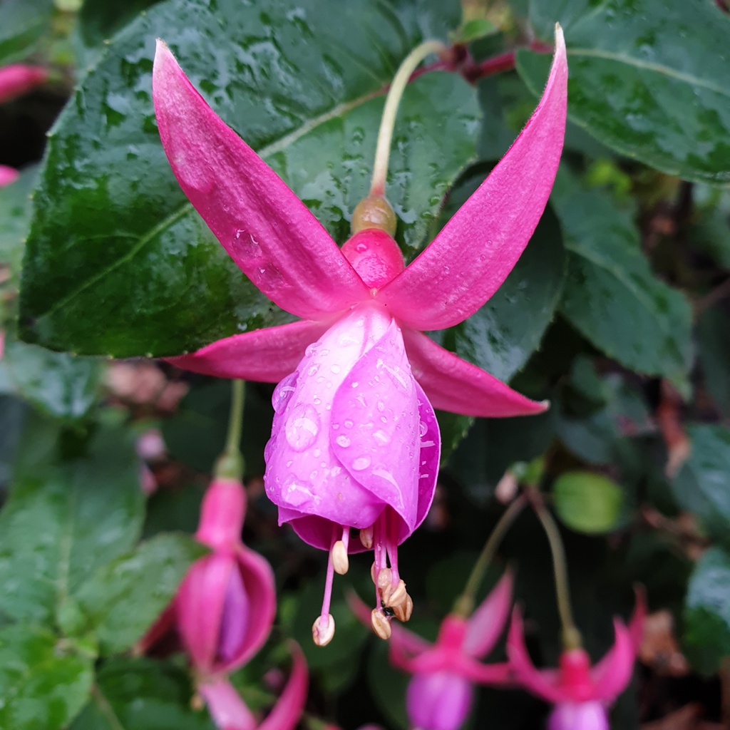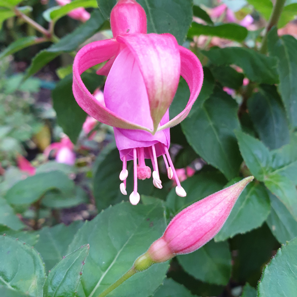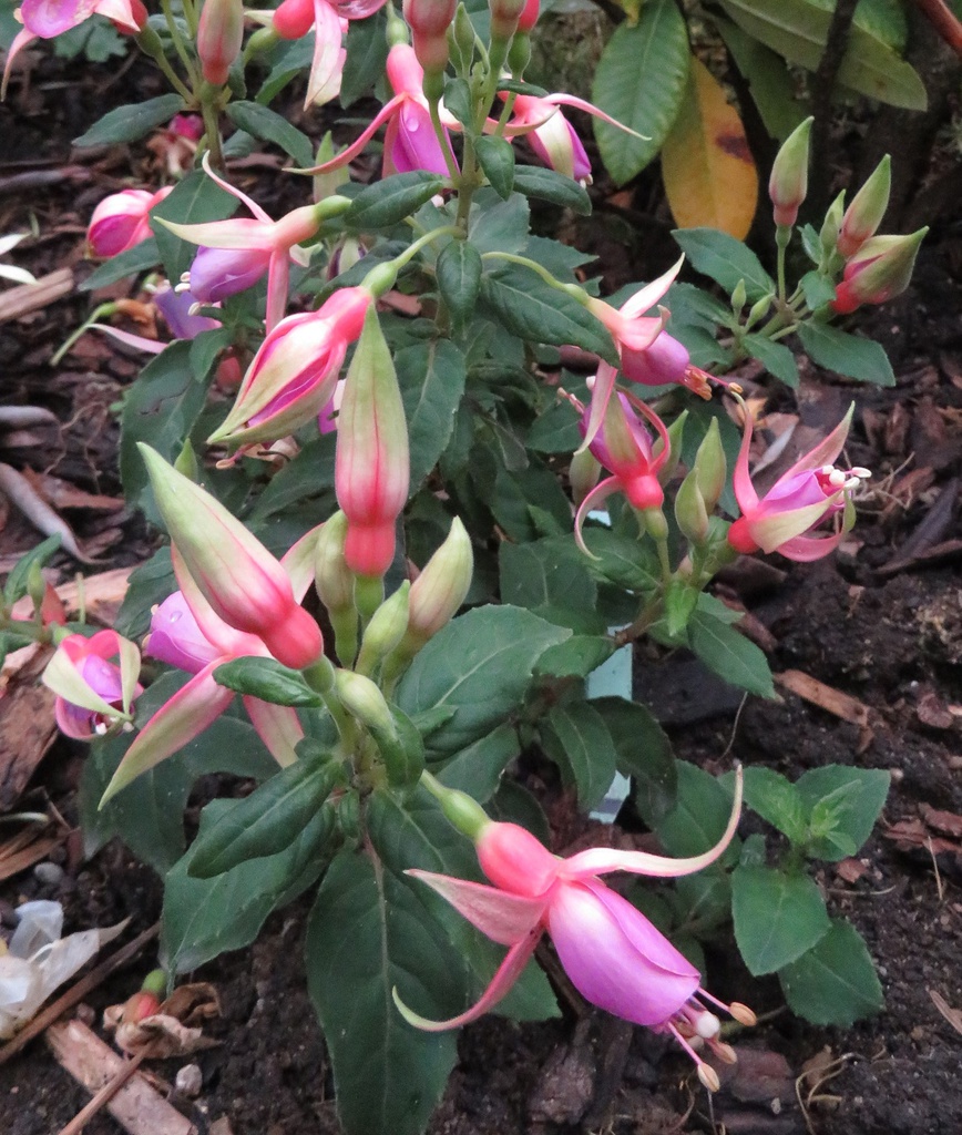 Die Margaret Roe ist mit 40 cm eine kleine Fuchsie für den Vordergrund. Sie ist vom Laub hellgrün und die einfache Blüte in Rosa Sepalen mit grünen Spitzen und hellvioletter Korolle. Die Blüten hängen nicht, sie stehen fast waagerecht ab. Empfehlenswert, sie steht bei mir seit 2019.