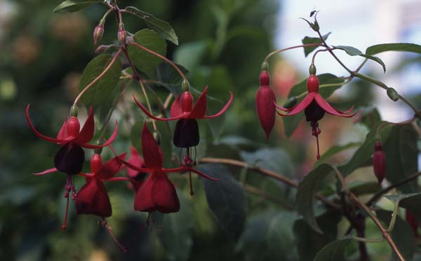 Herr Dr. Haslinger,Hanau,ist langjähriges Mitglied der DFG und ein sehr interessierter,kenntnisreicher Fuchsienfreund. Er beschäftigte sich zunächst viele Jahre erfolgreich mit der Iriszüchtung. Als er dann in den achtziger Jahren mit der Züchtung von neuen Fuchsiensorten begann,hatten es ihm die damals relativ neuen,Aufsehen erregenden auberginefarbigen Cultivare von Lutz Bögemann und anderer Züchter besonders angetan. Als Eltern von 'Melanie' benutzte er z. B. die alte deutsche Sorte 'Gruß aus dem Bodethal' (Sattler und Bethge,1894) mit der schon außergewöhnlich schwarzblauen Korolle und als Kreuzungspartner die in allen Teilen der Blüte intensiv auberginefarbene 'Foolke' (Bögemann,1984). Das Ergebnis kann sich sehen lassen. Die Blüte von 'Melanie',mittelgroß mit wächsern glänzendem dunkelrotem Kelch und wohlgeformter,tief dunkelvioletter einfacher Korolle,gleicht zwar in der Form noch der Muttersorte, die Farbbeständigkeit und Farbintensität sind aber deutlich verbessert. Der etwas steife Wuchs von 'Foolke' mit den extrem langen Internodien ist bei 'Melanie' einer aufrecht/ buschigen,gefälligeren Wuchsform mit elastischen,etwas überhängenden Zweigen gewichen. Das zierliche Laub an roten Stielen,fast ganzrandig,ist ein weiterer Pluspunkt. Allerdings bekommt es in kühlen Nächten die bräunlichen Flecken,die uns von manchen alten Sorten bekannt sind. Also besser nicht zu früh ins Freie stellen. Die Pflanze blüht sehr reich - mit vier Blüten aus jeder Blattachsel - ohne Unterbrechung von Anfang Juni bis zum Saisonende. Für Menschen mit einer Vorliebe für subtilere Farben ist der Kontrast von Laub und Blüten bei 'Melanie' ein Fest fürs Auge.