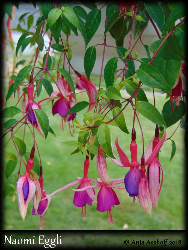 Diese Sorte bildet unheimlich lange und feine Triebe innerhalb einer Saison. Ich habe sie weit oben im Apfelbaum hängen und die Triebe mit ihren unzähligen Blüten sehen aus wie ein Wasserfall. Standort: Halbschatten. ( entnommen aus Fuchsienkurier 3-2019)