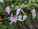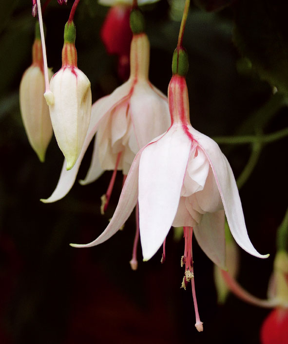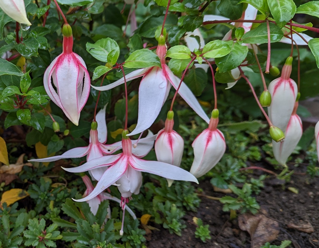 ‘Piper‘ ist eine traumhaft schön blühende Sorte mit großen Blüten. Sie sieht immer gut aus, egal ob in der Ampel, als Hochstamm oder Busch. Im Topf sollte man sie rechtzeitig entspitzen. In der WHZ 7 winterhart. Wenn man ihr einen Sonnenplatz bietet, treibt sie auch sehr früh wieder aus. Als ich sie ausgepflanzt habe, mochte ich daran nicht glauben, denn sie hatte nur einen kleinen Wurzelballen und das ist erst einmal keine so gute Voraussetzung. Sie kommt aber zuverlässig wieder und 2019 war sie die erste Fuchsie bei der ich den Austrieb entdeckt habe. Sie hat eine Höhe von gut 40 cm erreicht und ist auch schön in die Breite gewachsen. Die 'Piper' ist damit auch in dieser Hinsicht einen Versuch wert. Die Blüten sind zwar nicht, wie von vielen gewünscht, reinweiß, aber gerade der rötlich gestreifte Tubus macht sie zum Hingucker. Sepalen und Korolle sind jedoch standortabhängig meist reinweiß.
