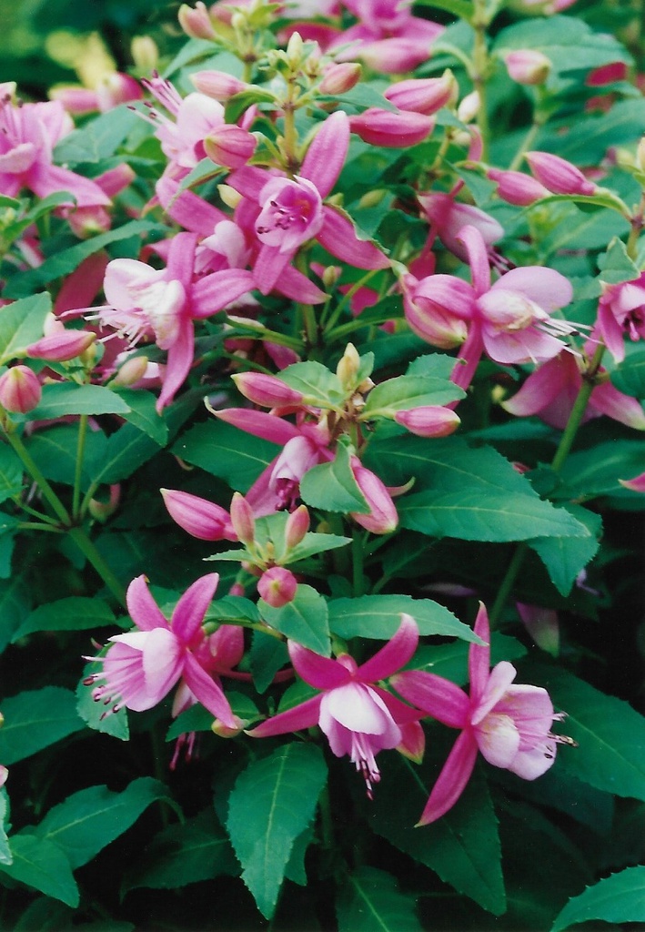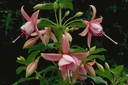 Sport von Pink Fantasia, einfache rosafarbene Blüten, seitlich abgestellt und deshalb sehr gut sichtbar. Sehr reich blühend, kräftig aufrecht wachsend. Optimale Eignung als Busch und als Beetfuchsie, da die Blüten nicht versteckt sitzen.