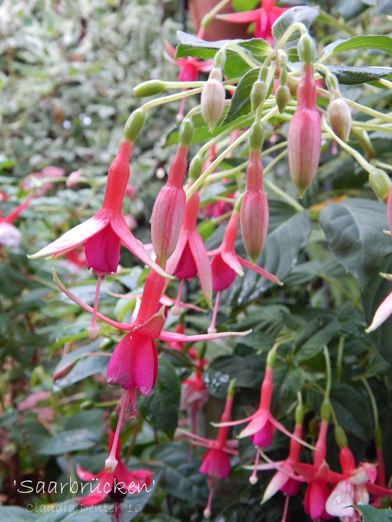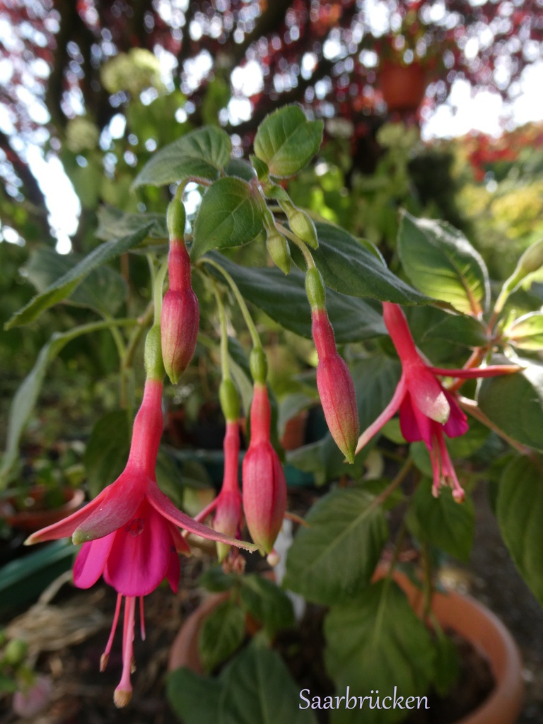 'Saarbrücken' aus der Hand des saarländischen Züchters Josef Jehle, ist eine stark wachsende, aufrecht wachsende Fuchsie mit guter Blütenbildung. Sie macht keine Blühpausen und ist gut zu überwintern.