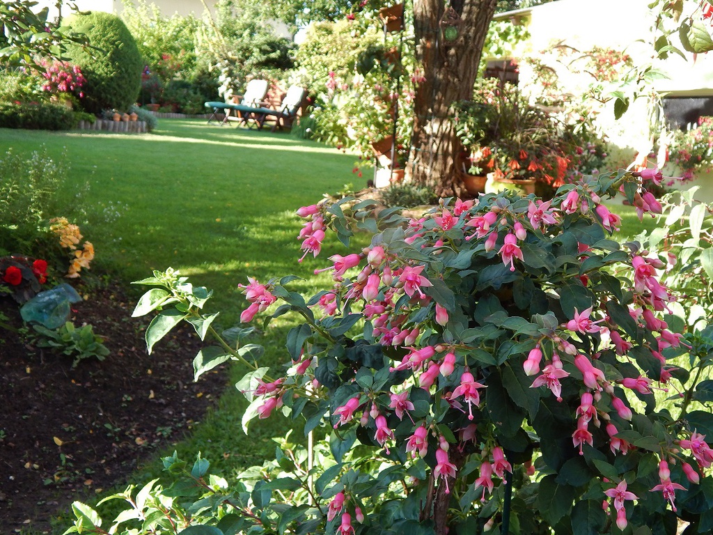Eine ungewöhnliche Fuchsie, die aber ihre Freunde hat. Man merkt der Fuchsie ihre Triphylla-Abstammung leicht an. Schon bei der Vermehrung braucht sie Zeit und auch mehr Wärme. Fehlt ihr insbesondere im Winter diese Wärme (12-15 °C), so leidet die Triphylla-Fuchsie und sie ist dann auch sehr für Botrytis anfällig. Also machen wir es dem Mädchen etwas wärmer. Die 'Schöne Wilhelmine' ist tagneutral, d. h., sie blüht unabhängig von der Tageslänge im Sommer wie im Winter. Ein Erbe von Mutter ('Leverkusen') und Vater ('Chang').Wenn andere Fuchsien im Sommer unter großer Hitze leiden, fühlt sich Die 'Schöne Wilhelmine' wohl und strahlt Frische aus. Ausgepflanzt im Freiland, im Topf oder Kübel macht sie in der Sommersaison keine Probleme. Besonders hübsch macht sie sich als kleines Fußstämmchen. Kaum jemand geht an ihr achtlos vorüber. Sie erhielt 2000 in Hohenheim bei der Bewertung des Gesamteindrucks von maximal 54 erreichbaren Punkten 46. Das war bei allen geprüften Sorten die höchste vergebenen Punktzahl