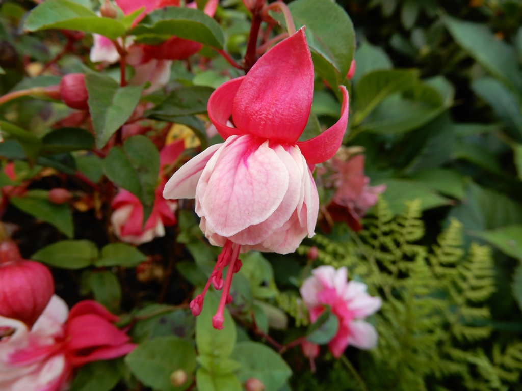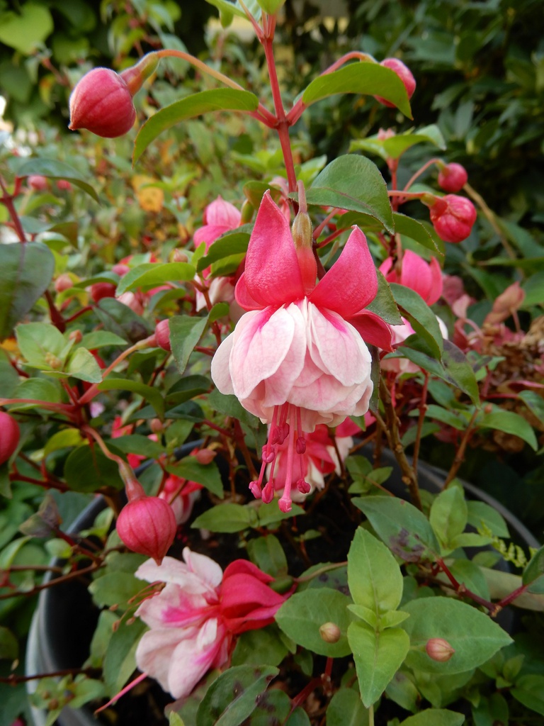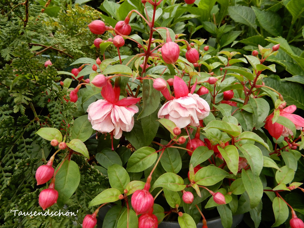 Tausendschön', eine sehr alte Sorte, war eine der ersten Fuchsien die ich hatte. Ich erwarb sie in einer ganz "normalen" Gärtnerei und ist auch heute noch leicht zu bekommen, denn die Jungpflanzenbetriebe führen sie in ihrem Sortiment. Sie blüht sehr reich und ist absolut unempfindlich. Vielleicht auch deshalb der Name Tausendschön wie unser Gänseblümchen?