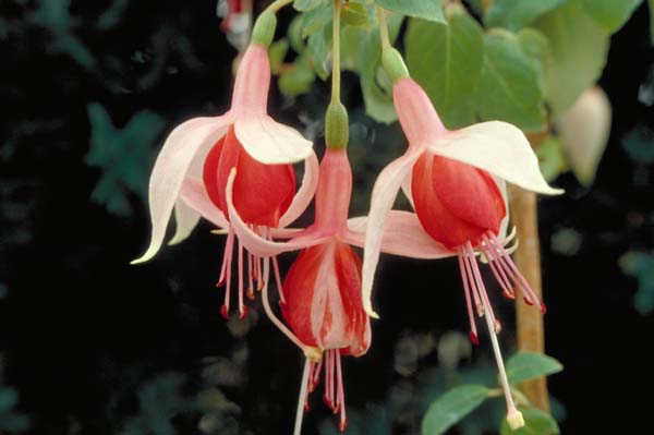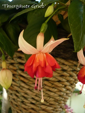 Blüte einfach bis halb gefüllt,Tubus und Sepalen weiß,Korolle leuchtend rot,orange geflammt. Wuchs halbhängend. Dankbare kompakt wachsende Sorte. Unempfindlich gegen Wind und Regen. Blüht reichlich in der Sonne wie im Schatten.