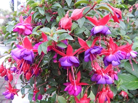 Die Fuchsie 'Uschi Wolf' ist eine,mit ihrer lebhaften und leuchtenden Farbkombination,hervorragende Beetfuchse. Ein regelrechter Blickfang! Die Blüten sind halbgefüllt,erscheinen manchmal auch nur einfach und stehen schön über dem Laub. Sie behält ihr Farbe bis zum Verblühen und muß kaum ausgeputzt werden.Diese Fuchsie blühte bei mir den ganzen Sommer über in einem halbschattigen Beet ohne Blühpause! Sie ist aber auch für den sonnigen Standort geeignet.Frau Uschi Wolf war ein langjähriges und aktives Mitglied bei der DFG und war bis zu ihrem Tode Mitglied unseres Freundeskreis "Saar-Pfalz". Aus dieser aktiven Zeit ging eine langanhaltende Freundschaft zu Herrn Jehle hervor. Herr Jehle überraschte sie eines Tages mit dieser schönen Fuchsie.