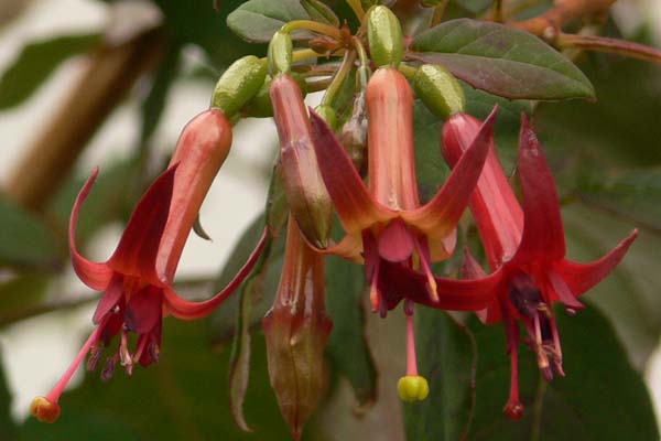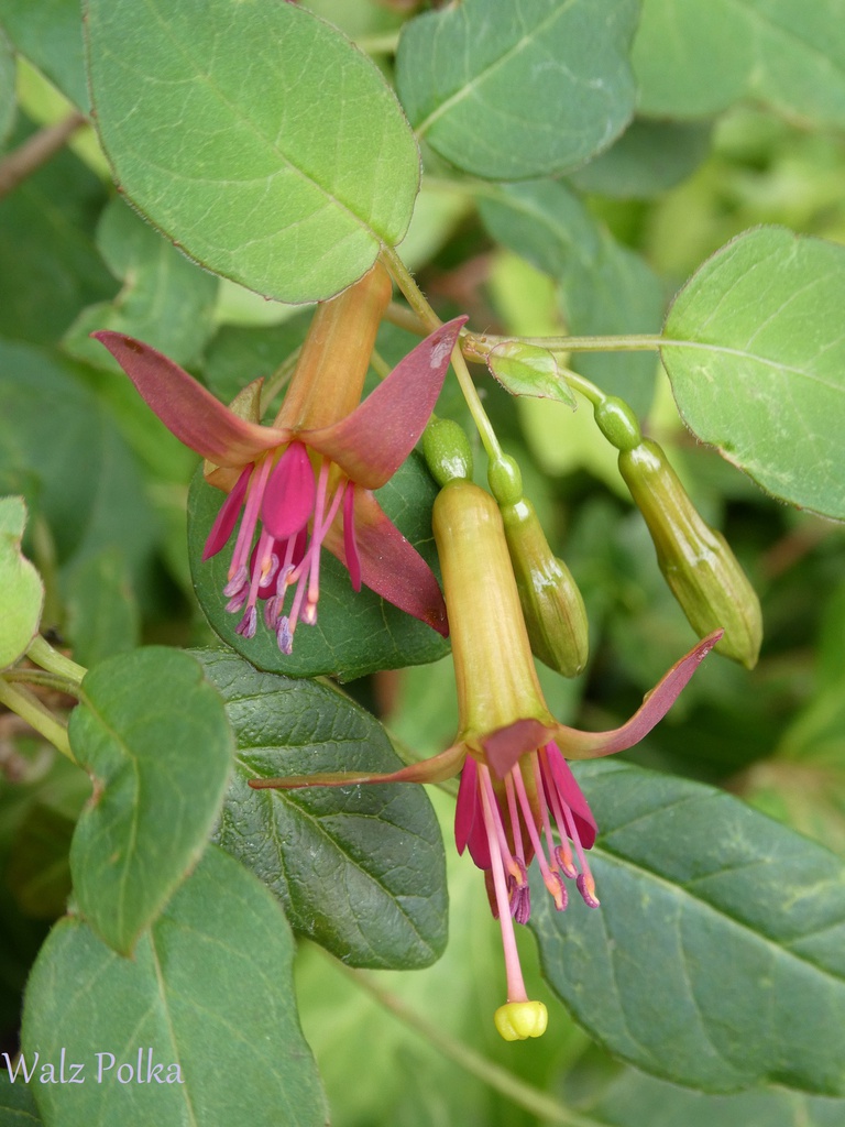 Walz Polka ist eine sehr empfehlenswerte Fuchsie für den Liebhaber ausgefallener Pflanzen. Bei ihr schlägt der neuseeländische Anteil der Kreuzungspartner(colensoi & procumbens) stark durch - auch im Laub, dass sich an einem sonnigen Standort bronzebraun verfärbt. Ich habe sie in einer Staudenrabatte mit neuseeländischen Pflanzenintegriert (mit Bronzeseggen, Hebe, Fiederpolster und Stachelnüsschen),was ein sehr harmonisches Bild abgibt. Die Walz Polka hat sich als gut winterhart erwiesen! In meinem Garten (Bechtheim, Rheinhessen, Lösslehm-Boden) hat sie Dauerfrost mit Temperaturen um -16°C ohne Schutz gut überstanden. Allerdings blüht die ausgepflanzte Fuchsie erheblich später als ein weiteres Exemplar, dass in einer flachen Tonschale auf einer warmen, besonnten Mauer steht. Letztere Pflanze blüht bereits seit Mai ununterbrochen und produziert jetzt (Anfang Oktober) immer noch etliche Knospen. Im Beet gepflanzt bildet sie einen kompakten Busch, die Pflanze in der Schale hat lange überhängende Triebe entwickelt und verholzt sehr schnell, was ihr mit den braunen Blättern einen sehr schönen Habitus verleiht. Sie ist wüchsig und sehr gesund und würde bestimmt auch einen ausgesprochen schönen Hochstamm abgeben! Die frisch geöffneten Blüten sind grünlich-bräunlich mit einer rotvioletten, stark reduzierten Korolle und ebenfalls rotvioletten Pollen. Im Abblühen verfärbt sich die ganze Blüte rotbraun. Die Pflanze passt (auch in Schalen) ganz besonders gut zu Carex buchananii, der Bronzesegge. Als Bodendecker kann ich das Fiederpolster (Leptinella, Synonym Cotula)oder das Stachelnüsschen (Acaena) sehr empfehlen. Diese passen überhaupt sehr gut zu sonnenverträglichen Freilandfuchsien!